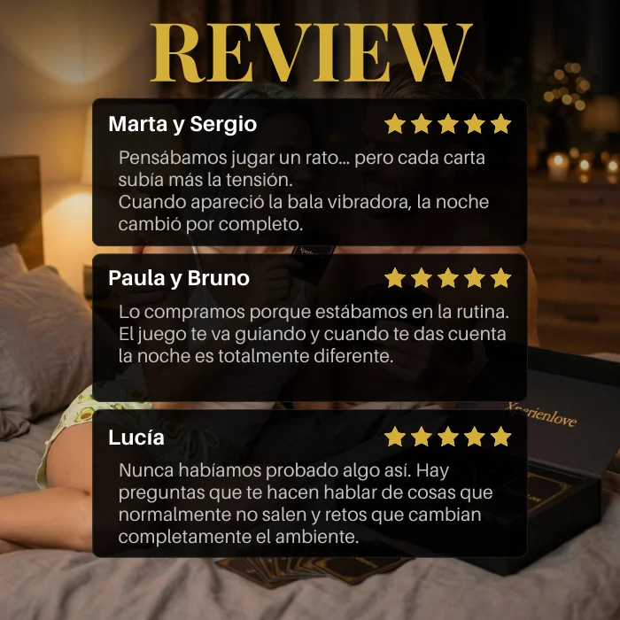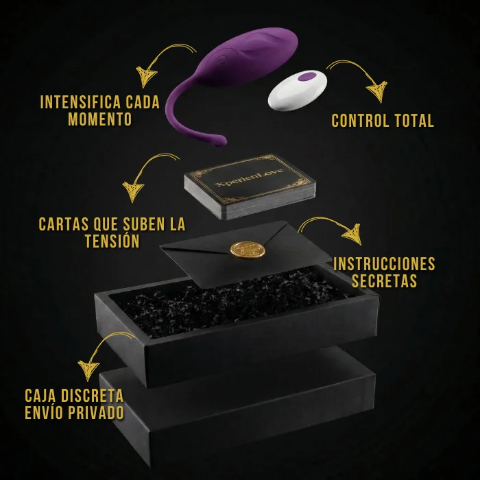 Recibiréis el juego erótico personalizado con vuestros nombres, las cartas con preguntas y retos, la bala vibradora con mando, packaging elegante y regalo exclusivo de un ebook incluido (solo hoy).